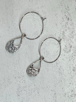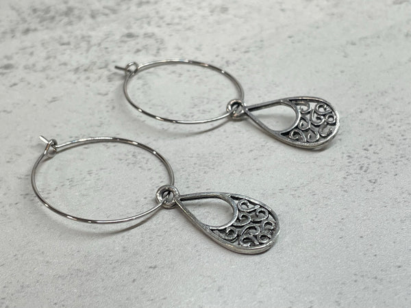 Step up your style with these Silver Teardrop Scrolls Hoop Earrings - crafted with scroll designs, silver teardrops, and a simple, elegant shape. Lightweight and fashion-forward, these earrings are your new shortcut to stylish success! Take the risk and make a statement today.