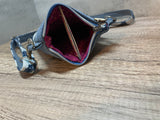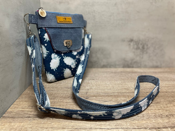 An adorable sheep print and denim cross-body bag features an adjustable crossbody strap. It is fully lined with lovely cotton polka dot print. Great for a pair of sunglasses, your keys, money and cards, and most cell phones. All your essentials will be with you but not weighing you down