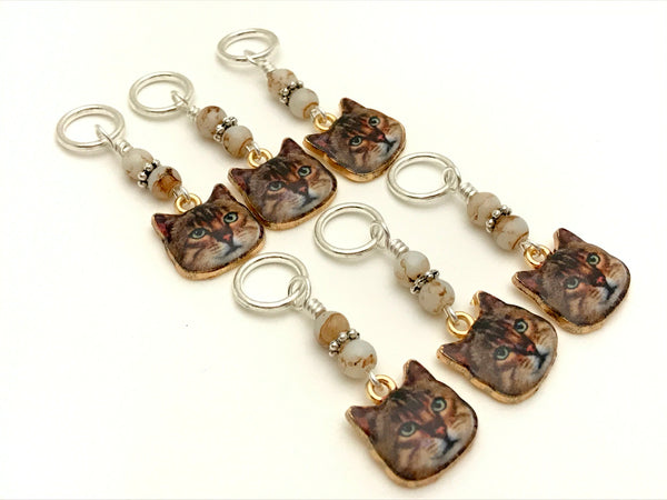 Adorable brown face kitty cat charms hang from this snag free stitch marker set. Knitting markers that will not snag your yarn, they are constructed with the knitter and yarn in mind. All possible openings are permanently closed and smooth for snag free results.