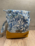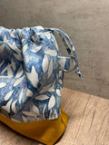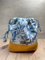 Drawstring project bag features fabric drawstrings to make closing the bag quick and easy. Includes a handle and outside ring where you can attach some stitch markers.
