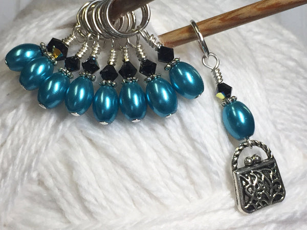 This Teal Stitch Marker Set is designed to make your projects easy and snag-free. It comes with one lead marker with purse charm and 8 additional beaded markers. An ideal gift for knitters, this set allows for smooth crocheting and knitting, no matter the project.